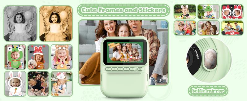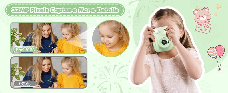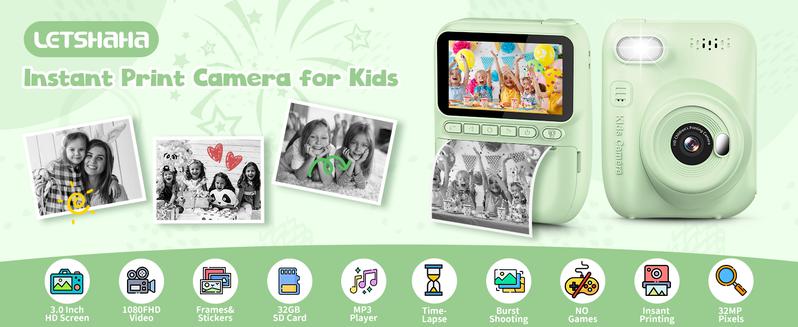 The LETSHAHA Kids Instant Print Camera features a 3.0-inch IPS HD screen, offering video recording, timed photos, burst shooting, fun photo frames, and various filters to capture every meaningful moment of childhood! Highlights: