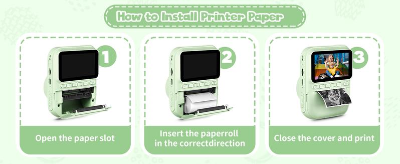 Our instant camera uses ink-free printing technology to produce black-and-white photos without toner! Kids can snap photos anytime, anywhere, and enjoy the joy of photography and creativity. Note: Continuous printing of 7-10 photos may activate overheating protection. Allow the camera to cool before resuming use.