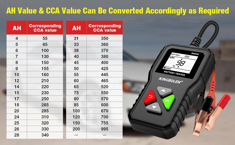 The KINGBOLEN BM550 battery tester is designed to test all 6V, 12V, and 24V batteries, ranging from 100-2000 CCA. It supports batteries from 2Ah to 220Ah, requiring the entry of the corresponding CCA value. It tests regular flooded, AGM flat plate, AGM spiral, GEL, and EFB batteries. Not suitable for deep cycle batteries.